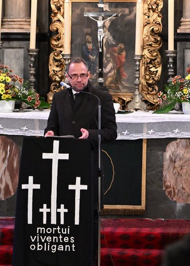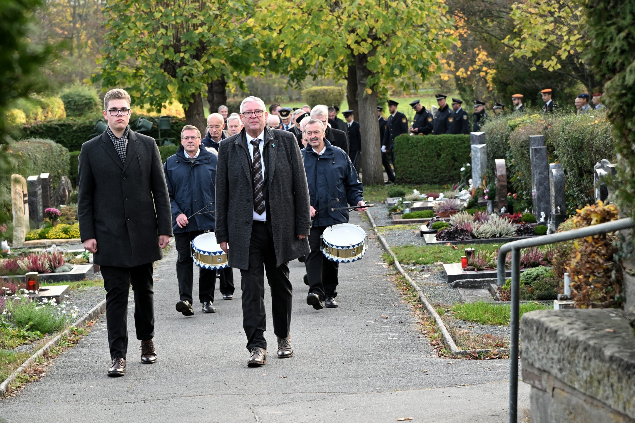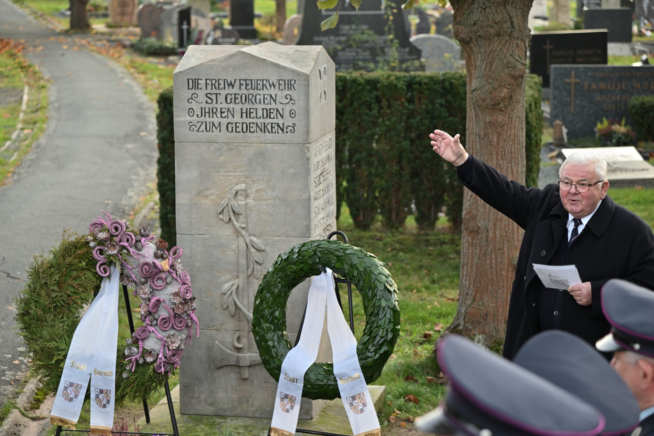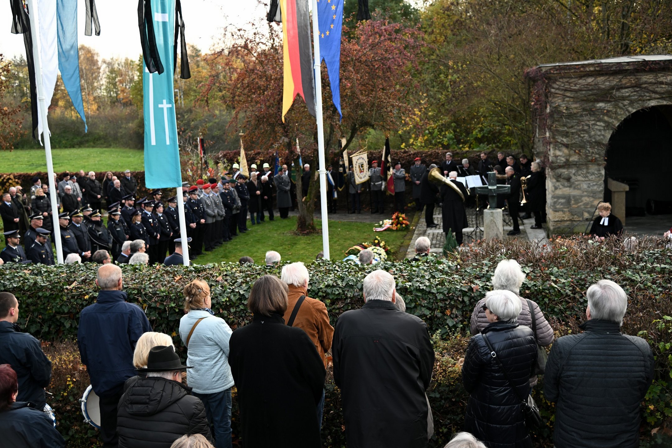Die Gedenkrede für die Bayerische Staatsregierung hielt Staatsminister Thorsten Glauber. Er lenkte den Blick zurück auf die Jahre 1921 und 1922, als kurz nach dem Ersten Weltkrieg eben hier in Bayreuth ein erstes großes Kriegstoten-Gedenken und ein Jahr später in Berlin erstmals reichsweit der Volkstrauertag ausgerichtet wurde. Vielen Menschen in Deutschland fehlte ein Ort der Trauer. Väter, Söhne, Männer, Brüder waren auf Schlachtfeldern geblieben oder von den neuen Artilleriewaffen bis zur Unkenntlichkeit entstellt. Es gab noch keine Gräber, die Tränen, Gebete und Gedanken hätten auffangen können. Der Volksbund Deutsche Kriegsgräberfürsorge nahm sich dieser Not an und etablierte einen Tag der Erinnerung an die gefallenen Soldaten, einen Tag der Solidarität derjenigen, die keinen Verlust zu beklagen hatten, mit denen, die um Gefallene trauerten. Aber auch ein Tag der Hoffnung, ein Symbol für einen Aufbruch in eine bessere Zukunft. Sein Großvater, der wiederum den Zweiten Weltkrieg als Soldat miterleben musste, habe, so Glauber, nicht viel über diese Zeit gesprochen. Aber wenn, dann sei seine Mahnung stets folgende gewesen: „Alles dürft Ihr Euch erlauben, nur keinen Krieg mehr!“. Nun sei er aber wieder da, der Krieg in Europa. Krieg, Pandemie, Inflation – die Parallelen zwischen heute und 1922 seien erschreckend und zudem sehen wir uns heute mit weiteren, selbstverschuldeten Krisen konfrontiert: „Der menschengemachte Klimawandel, die menschengemachte Umweltzerstörung und das menschengemachte Artensterben. Wir verlieren etwas, das uns wie geliebte Menschen festigt, das uns ausmacht und das uns Halt gibt. Diese von uns verursachten Veränderungen sollten wir gemeinsam aufhalten und bremsen.“