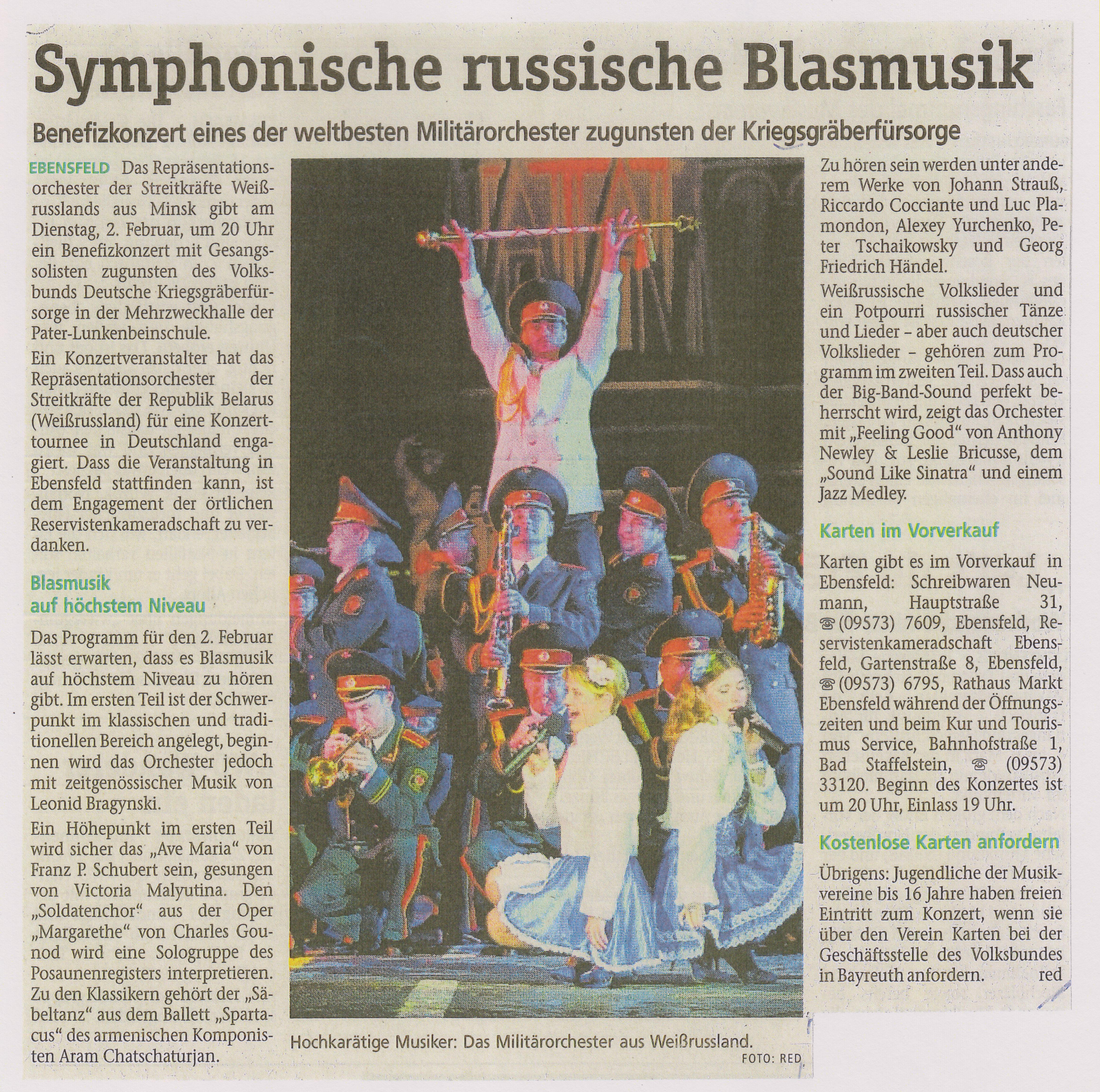 Das für Donnerstag, 12. März, geplante Konzert mit dem Repräsentationsorchester der Streitkräfte der Republik Belarus - Weißrussland - entfällt. Bedingt durch die Ausbreitung des Corona-Virus' ist den Weißrussen die Einreise nach Deutschland verboten worden.