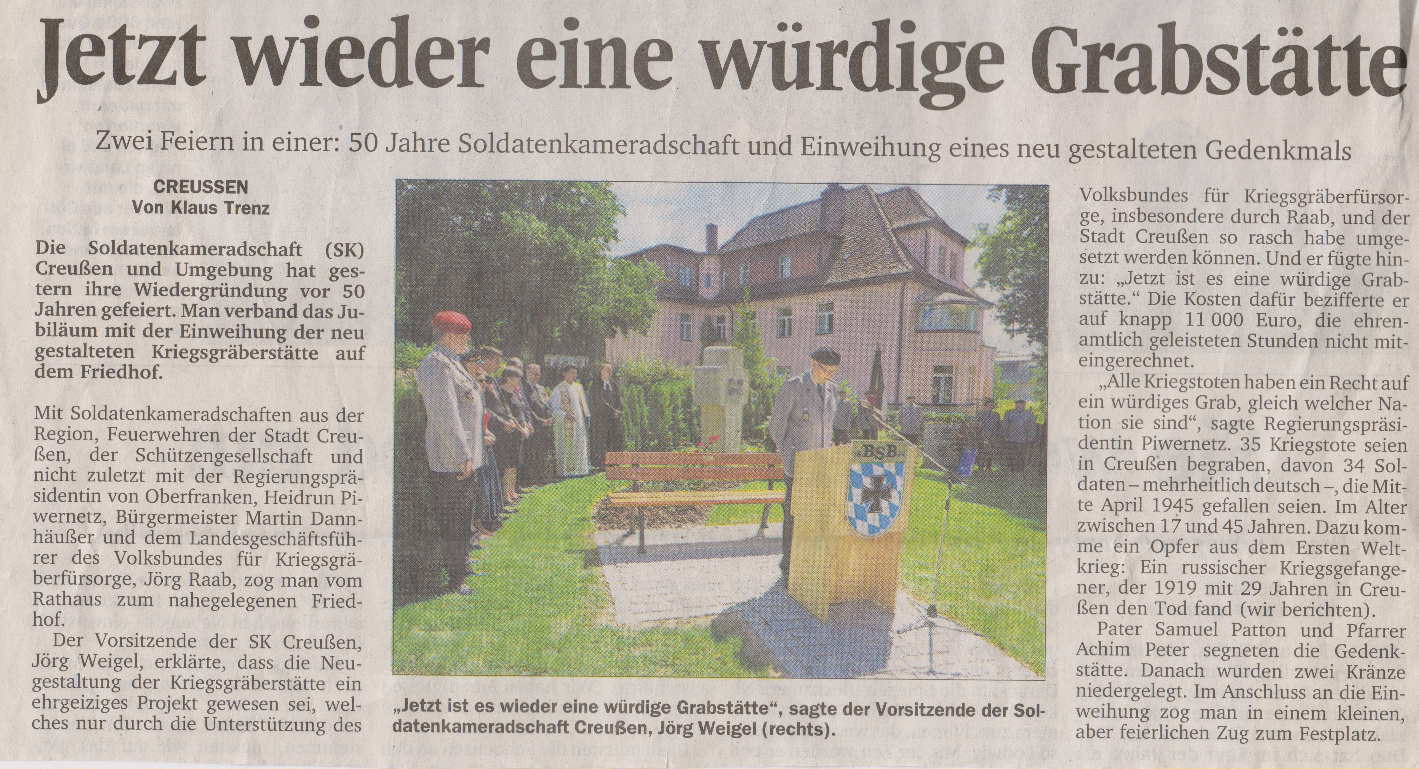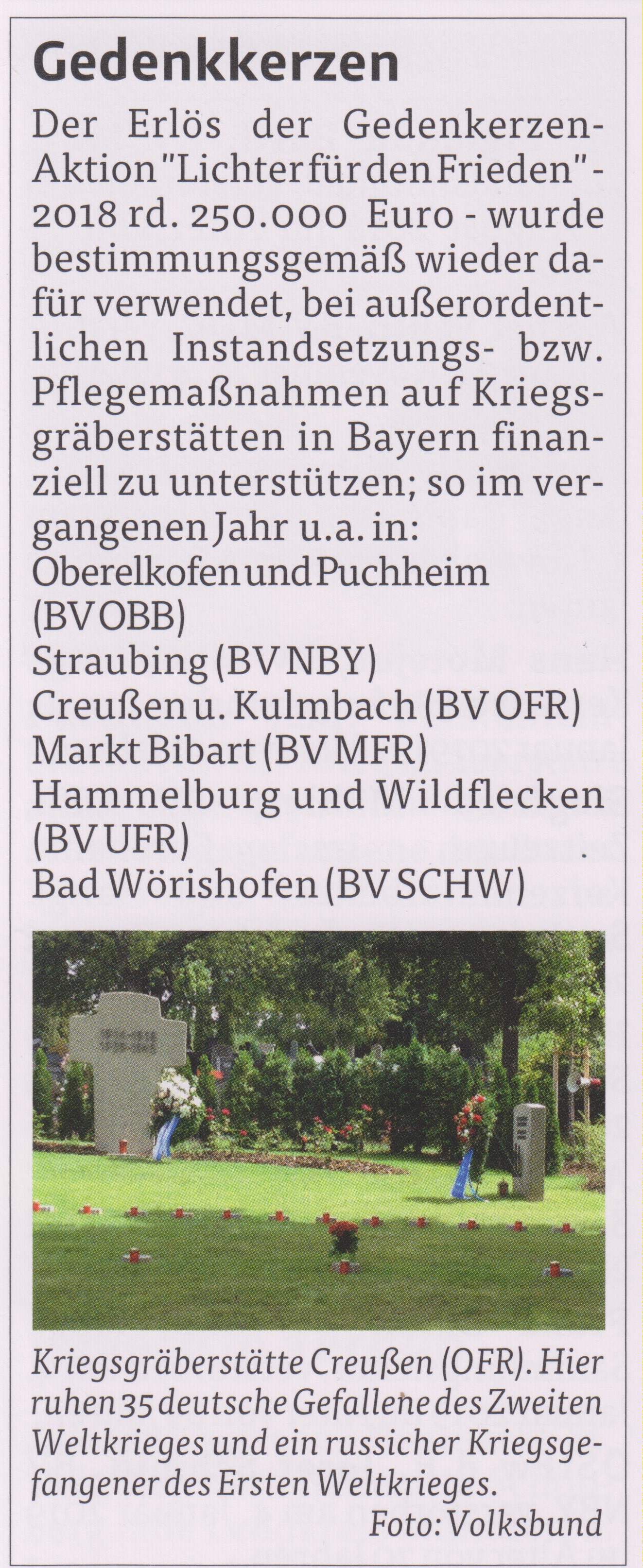 Im Freistaat ruhen rund 167.000 Tote von Krieg und Gewaltherrschaft. Ihre Gräber verteilen sich auf mehr als 540 Grablagen unterschiedlichster Größe auf Friedhöfen in rund 350 Kommunen. Nach dem Gräbergesetz (www.gesetze-im-internet.de „GräbG“) befinden sich diese Anlagen in aller Regel in der Obhut kommunaler oder kirchlicher Friedhofsträger, doch in vielen Fällen ist bei größeren Instandsetzungsmaßnahmen oder notwendigen technischen Investitionen eine zusätzliche beratende und finanzielle Unterstützung erforderlich. In den vergangenen Jahrzehnten konnten so mit Unterstützung des Volksbundes eine Vielzahl von Einzelmaßnahmen realisiert werden. Besonders freut uns, dass der Erlös der Gedenkkerzen-Aktion dazu beiträgt, die notwendigen Instandhaltungsarbeiten an oberfränkischen Kriegsgräberstätten mit zu finanzieren.