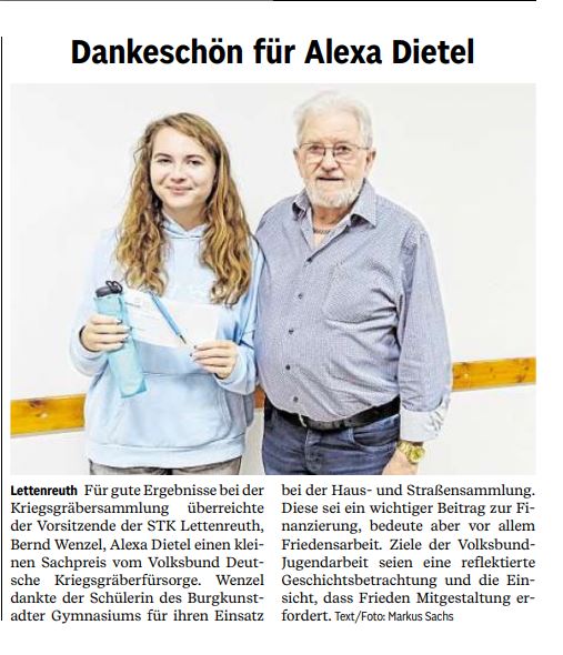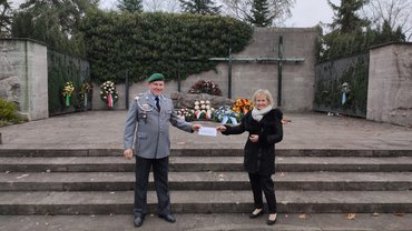 Parallel zur Haus- und Straßensammlung des Volksbunds Deutsche Kriegsgräberfürsorge, sammelte die Reservistenkameradschaft Bamberg bereits im zweiten Jahr „Schrott“ (Eisenschrott) und „Edlen Schrott“ (Buntmetall) zugunsten des Volksbunds. Das Ergebnis der diesjährigen Aktionen übergab RK-Vorsitzender Hubert Baumann am Volkstrauertag der ehrenamtlichen Geschäftsführerin des Volksbunds Kreisverband Bamberg, Gertrud Metzner. Metzner empfahl die pfiffige Idee zur Nachahmung und versprach, die Aktion bei einer erneuten Wiederholung im kommenden Jahr zu unterstützen und zu bewerben.