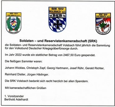 Die BSB Soldaten- und Reservistenkameradschaft Volsbach u.U. bedankt sich bei den Spendern im Ahorntal für ein herausragendes Sammelergebnis. Der Artikel erschien im Ahornblatt der Gemeinde Ahorntal im November 2022.